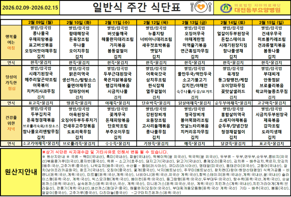 2026년 2월 2주차 식단표 페이지 정보 작성자 최고관리자 댓글 0건 조회 12회 작성일 26-02-25 17:16 본문 ※ 본 식단표는 환자분들께 제공되는 식단 안내입니다. 식자재 수급 및 병원 사정에 따라 일부 변경될 수 있습니다. 목록 이전글2026년 2월 3주차 식단표 26.02.25 다음글2026년 2월 1주차 식단표 26.02.25 댓글목록 댓글목록 등록된 댓글이 없습니다.
