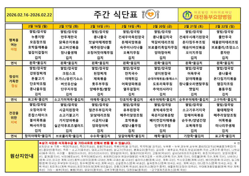 2026년 2월 3주차 식단표 페이지 정보 작성자 최고관리자 댓글 0건 조회 16회 작성일 26-02-25 17:18 본문 ※ 본 식단표는 환자분들께 제공되는 식단 안내입니다. 식자재 수급 및 병원 사정에 따라 일부 변경될 수 있습니다. 목록 이전글2026년 2월 4주차 식단표 26.02.25 다음글2026년 2월 2주차 식단표 26.02.25 댓글목록 댓글목록 등록된 댓글이 없습니다.