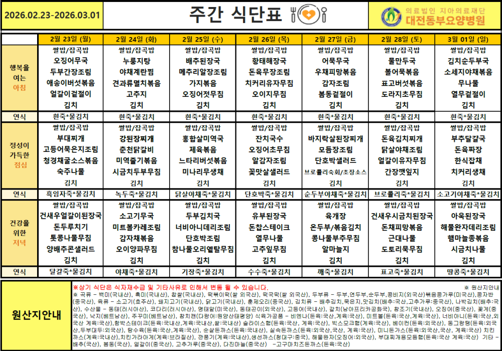 2026년 2월 4주차 식단표 페이지 정보 작성자 최고관리자 댓글 0건 조회 29회 작성일 26-02-25 17:19 본문 ※ 본 식단표는 환자분들께 제공되는 식단 안내입니다. 식자재 수급 및 병원 사정에 따라 일부 변경될 수 있습니다. 목록 이전글2026년 3월 1주차 식단표 26.02.27 다음글2026년 2월 3주차 식단표 26.02.25 댓글목록 댓글목록 등록된 댓글이 없습니다.