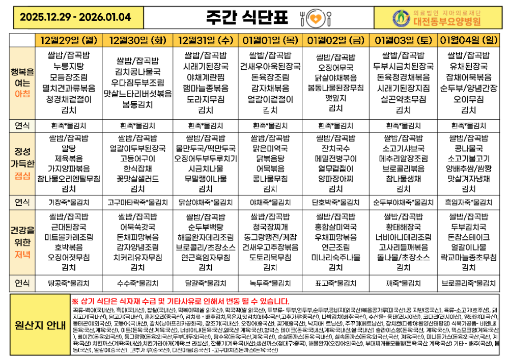 2026년 1월 1주차 식단표 페이지 정보 작성자 최고관리자 댓글 0건 조회 25회 작성일 26-02-25 17:09 본문 ※ 본 식단표는 환자분들께 제공되는 식단 안내입니다. 식자재 수급 및 병원 사정에 따라 일부 변경될 수 있습니다. 목록 이전글2026년 1월 2주차 식단표 26.02.25 댓글목록 댓글목록 등록된 댓글이 없습니다.