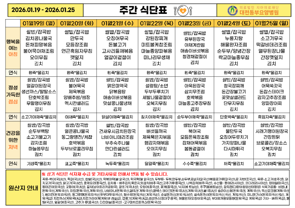 2026년 1월 4주차 식단표 페이지 정보 작성자 최고관리자 댓글 0건 조회 23회 작성일 26-02-25 17:12 본문 ※ 본 식단표는 환자분들께 제공되는 식단 안내입니다. 식자재 수급 및 병원 사정에 따라 일부 변경될 수 있습니다. 목록 이전글2026년 1월 5주차 식단표 26.02.25 다음글2026년 1월 3주차 식단표 26.02.25 댓글목록 댓글목록 등록된 댓글이 없습니다.